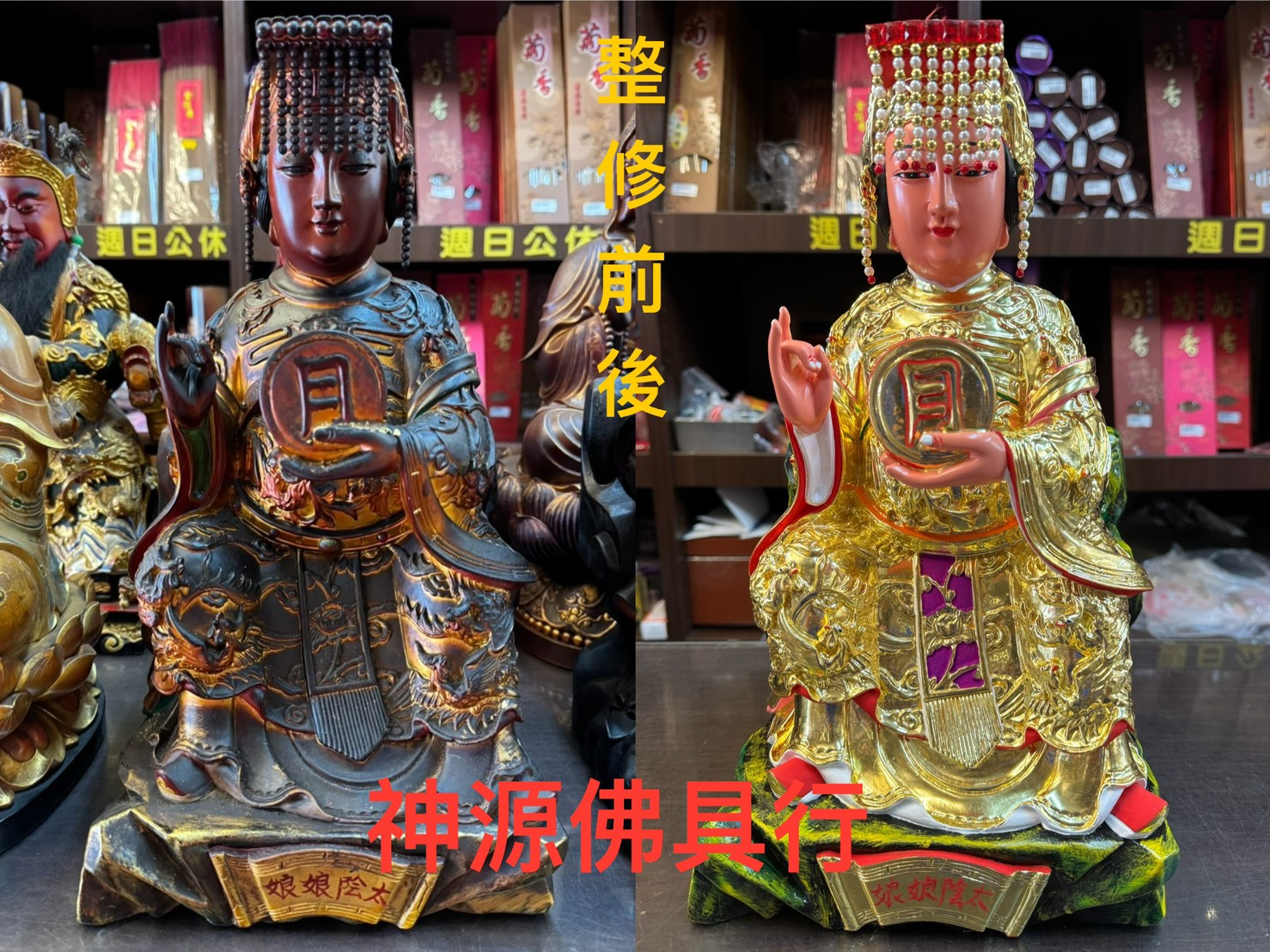 整修,佛像修補,神像整修,佛像整修 重粉神像,剃臉,修改神尊,神尊修帽 神尊安金,神像裂痕 程序:舊神像-清洗-修補-重安真金箔-彩繪