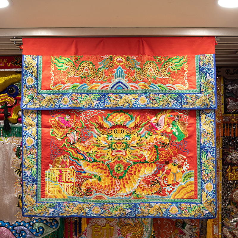 桌圍,桌裙,拜天公桌裙 紅絨布凸繡桌圍,正面猛龍桌圍 尺寸寬:3尺5